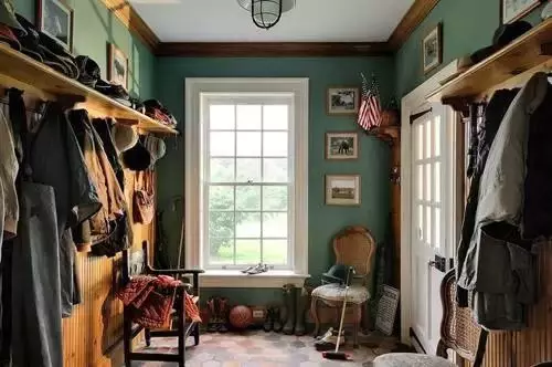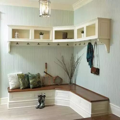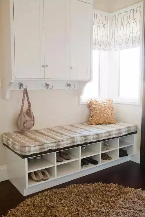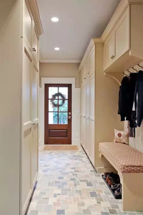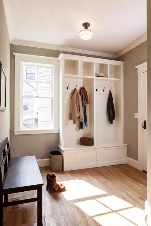 小玄关空间一般都是呈窄条形的,这样的玄关通常给人狭小阴暗的印象。所以建议这类玄关只在单侧摆放一些低矮的鞋柜,而上面的墙壁可以直接安装一个横杆直接架衣服。如果有需要,就安装一个单柜来收纳一些衣服,切忌柜子不能太多,否则会使本来就狭窄的空间更加拘谨。